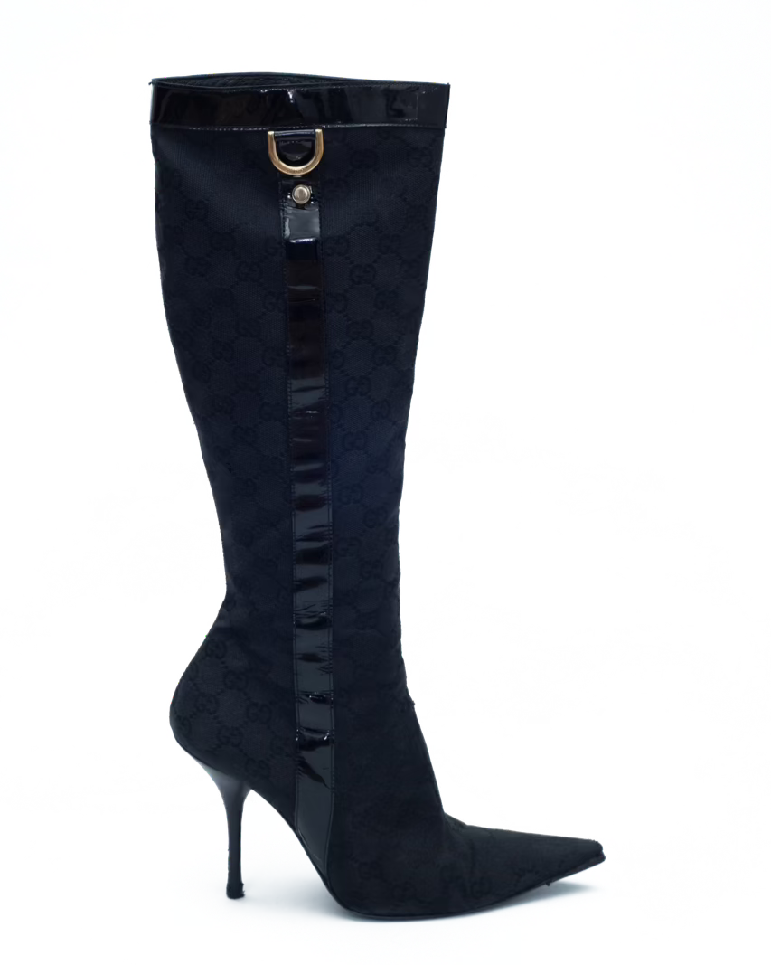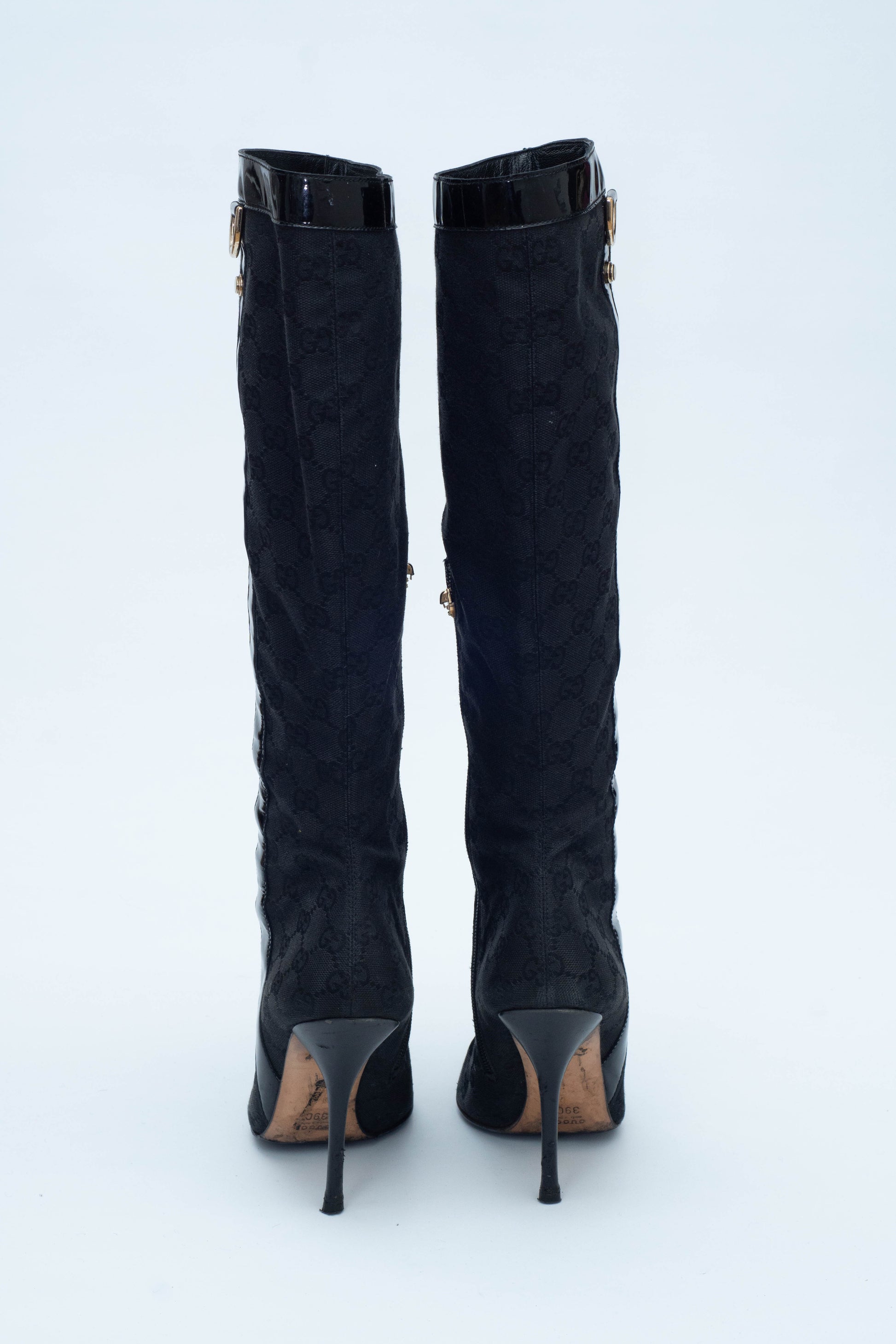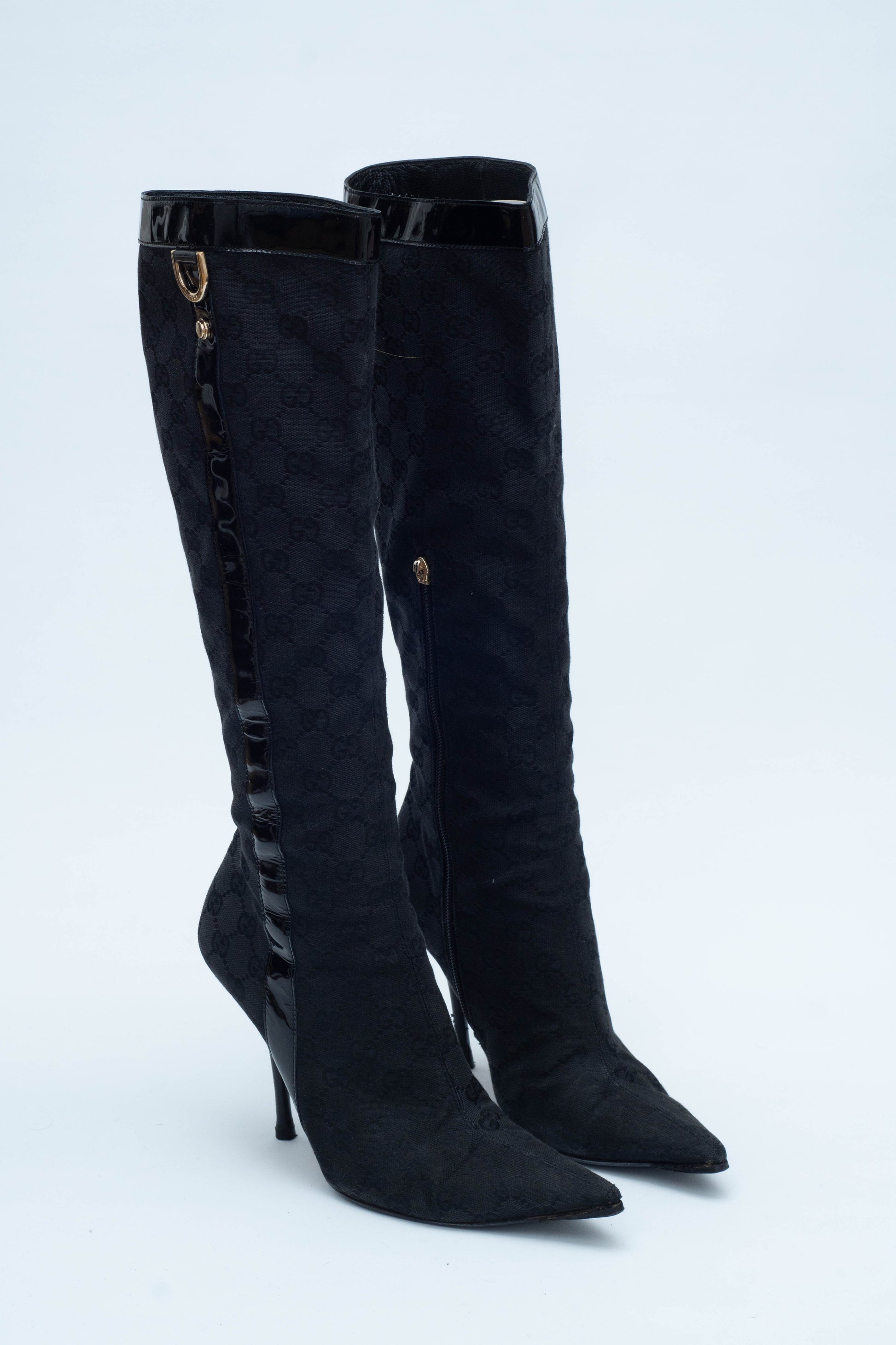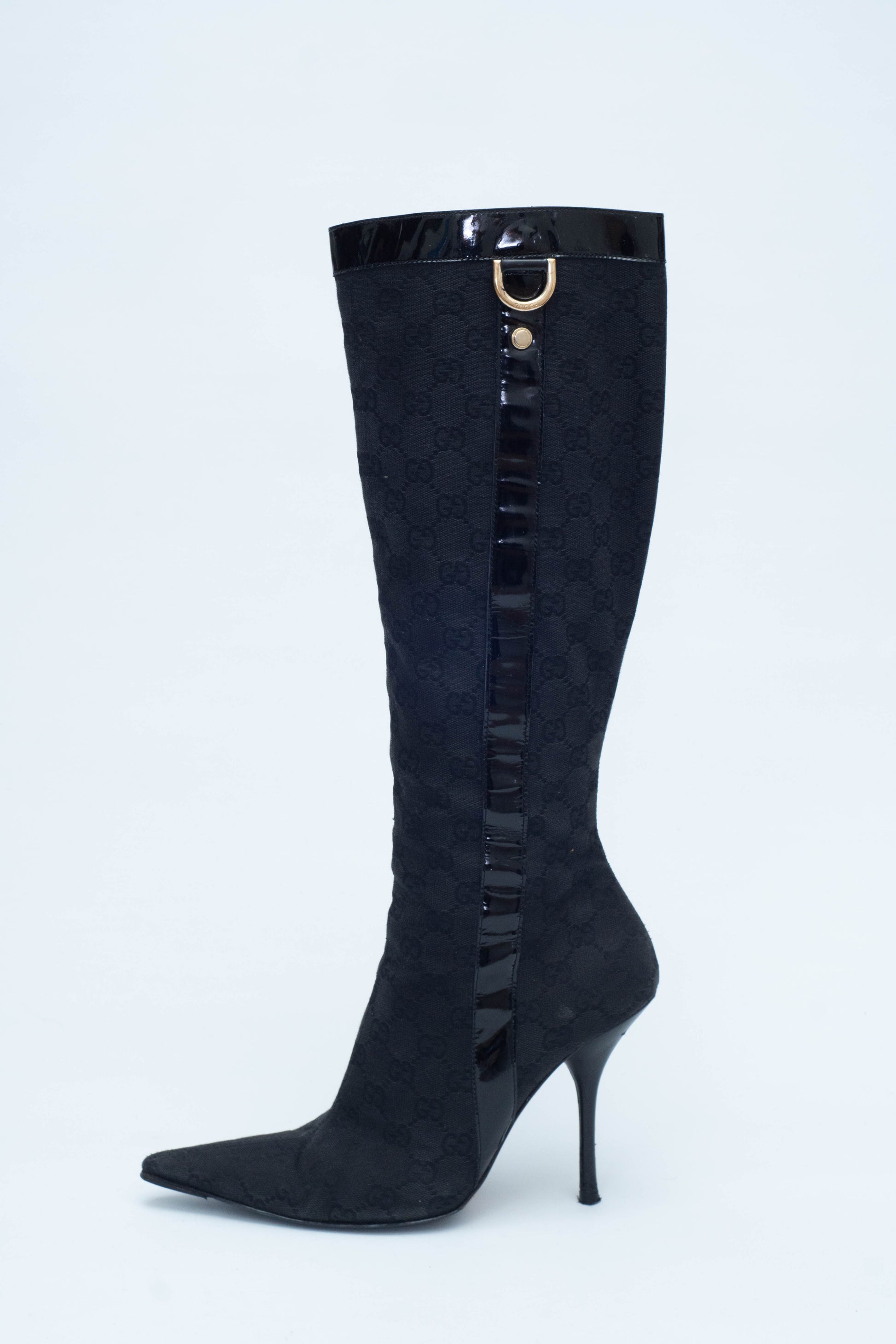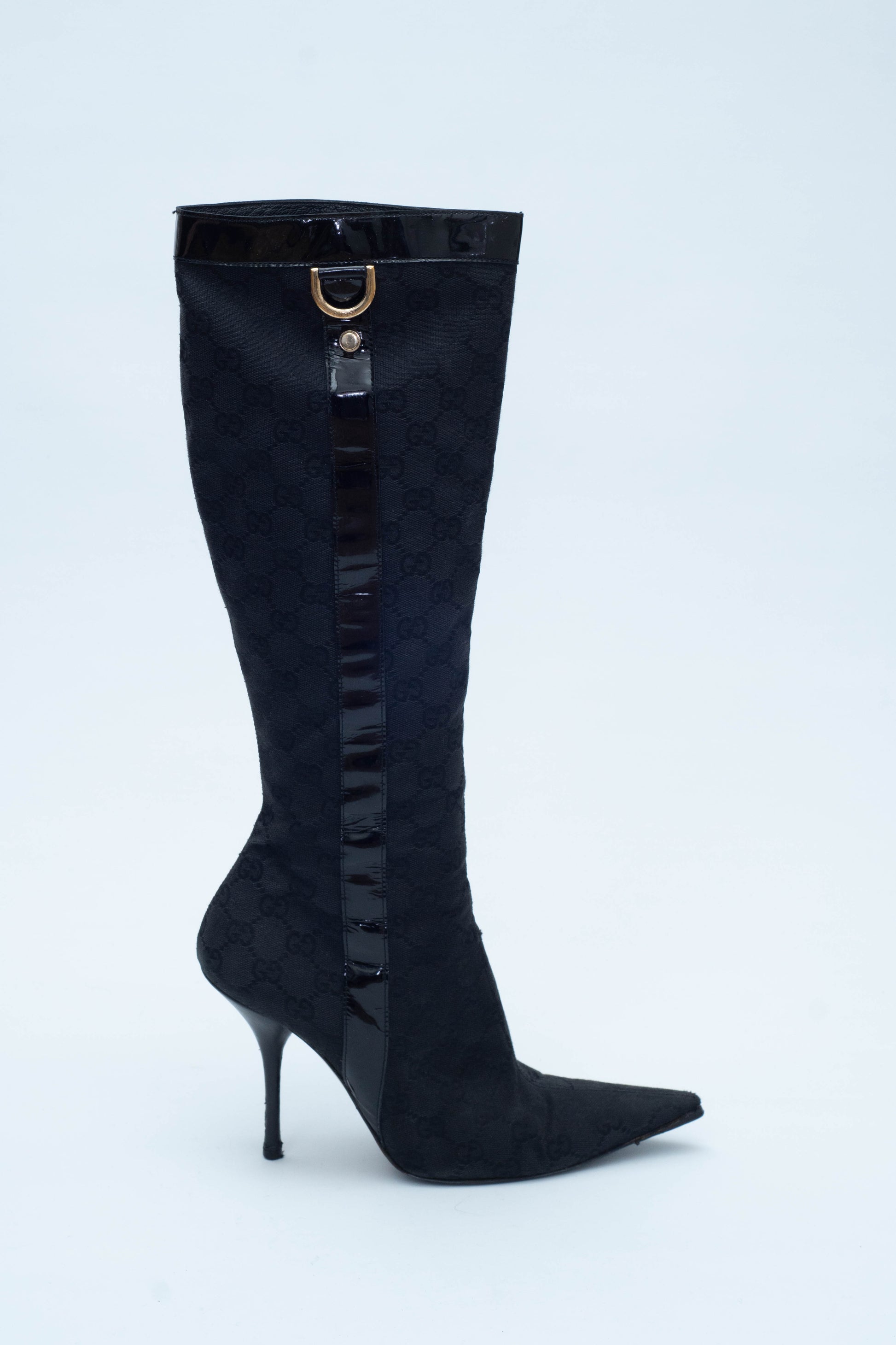 Gucci black monogram high-knee boots with patent leather details. The sexiest boots you can('t) find on the market. Excellent vintage condition, all blemishes are shown in the pictures. The zips must be fixed.