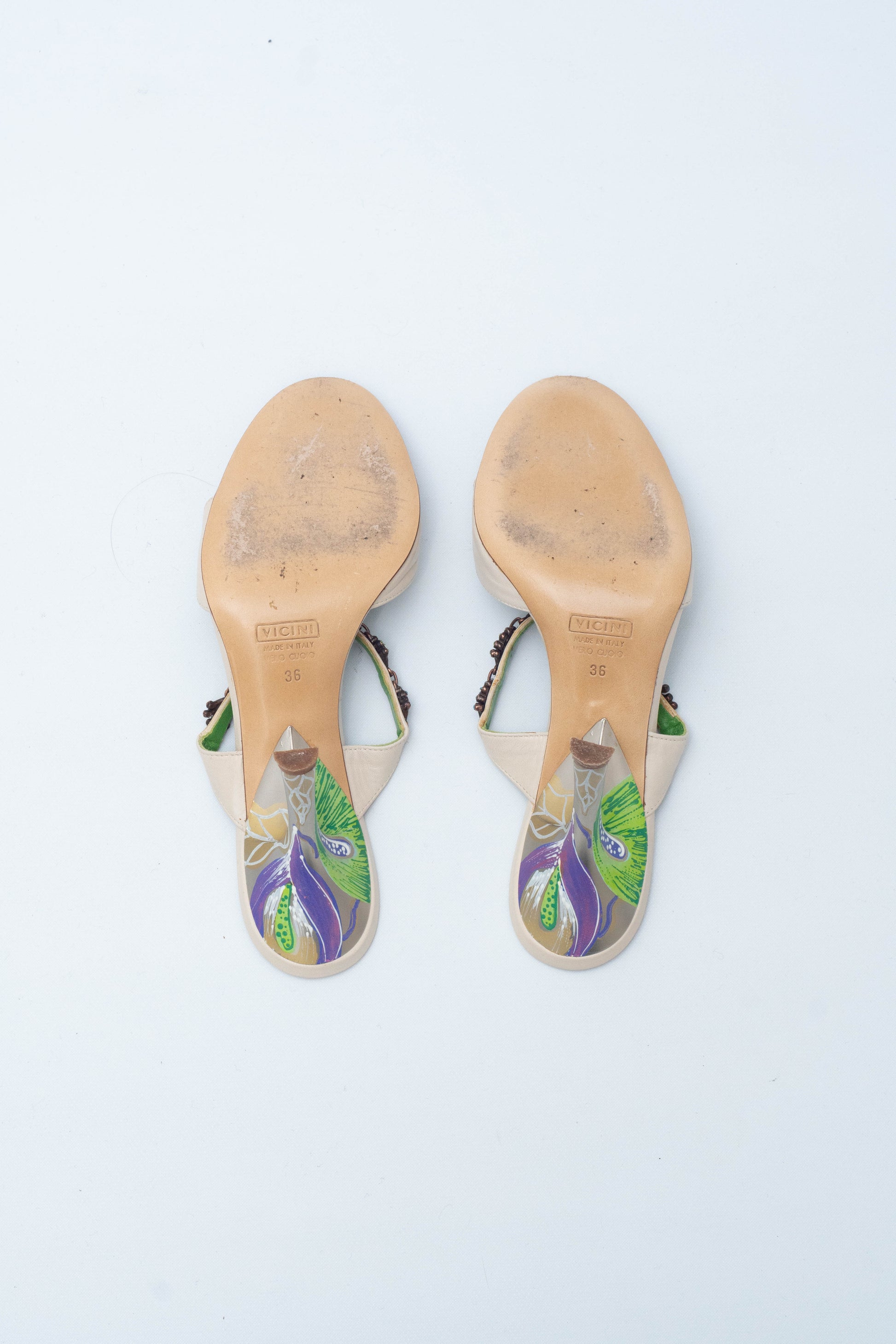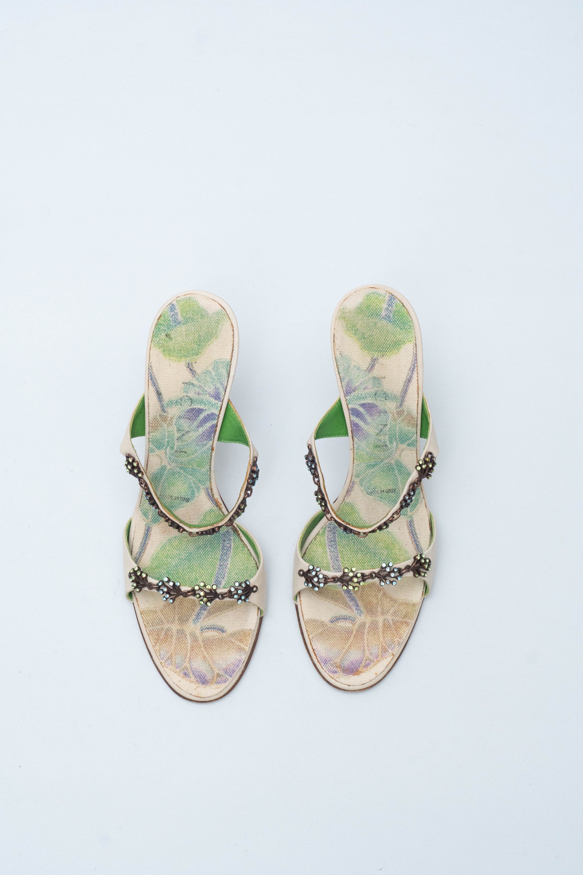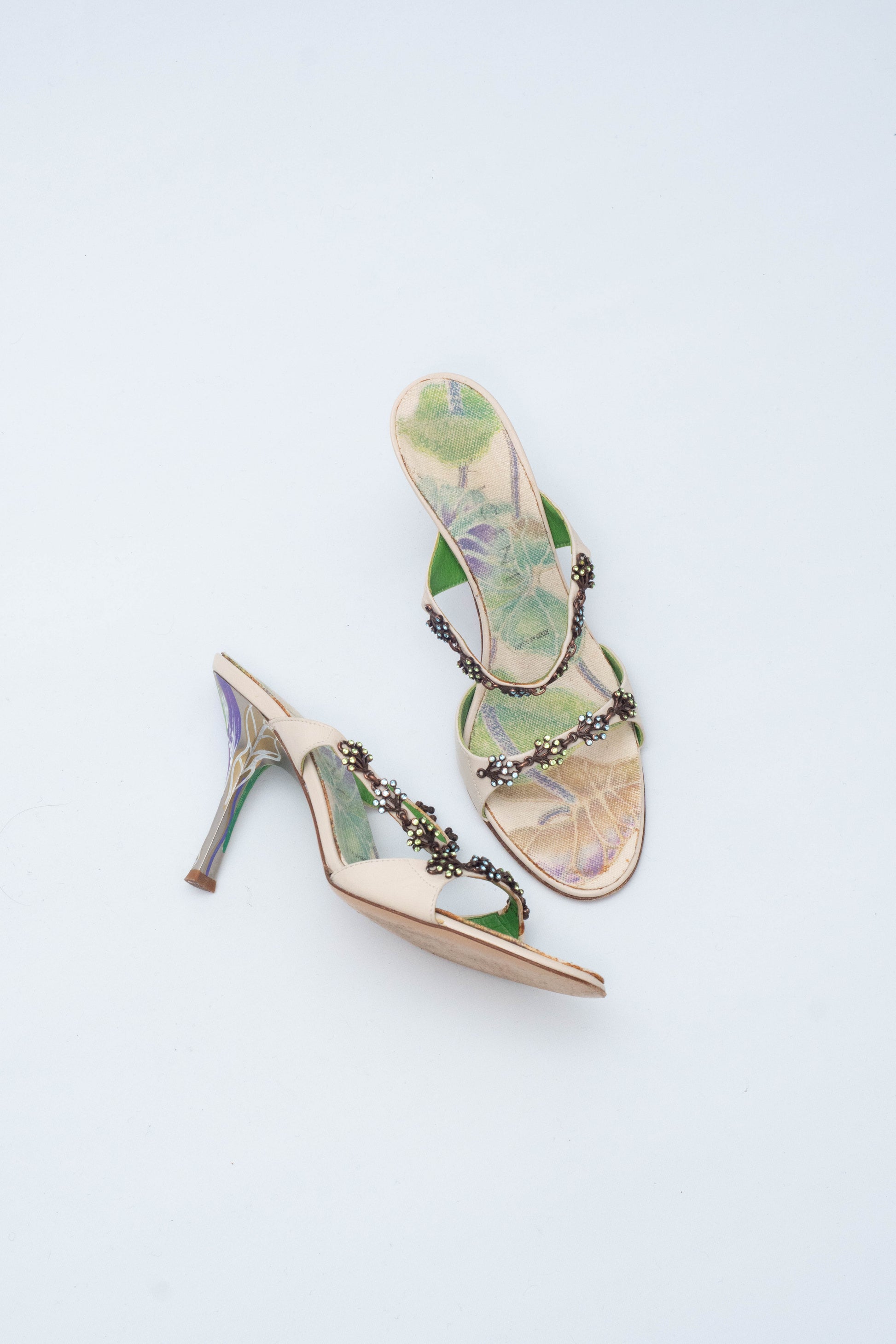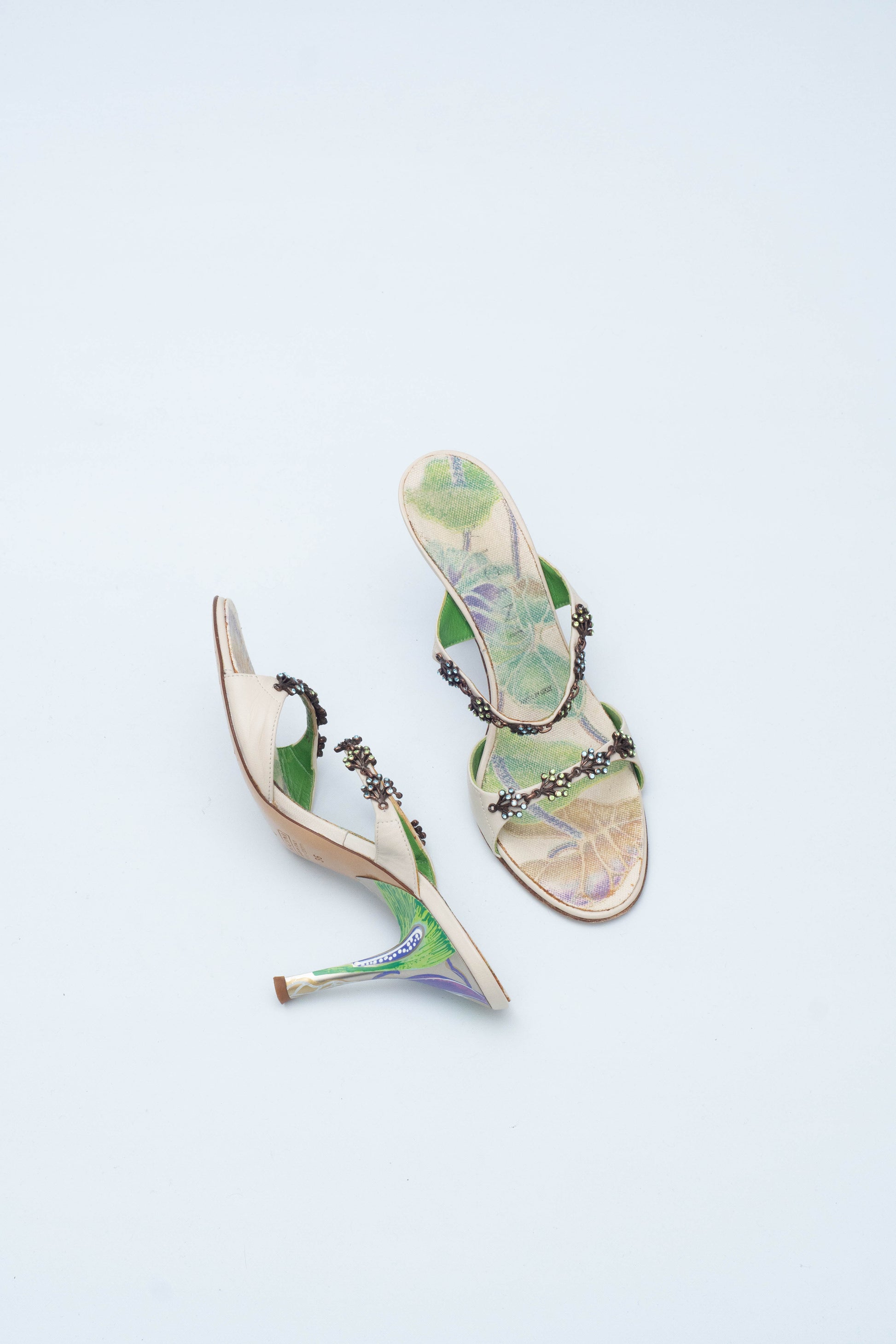 Rhinestones flowers Vicini heels with amazing details. A very unique pair for a very unique girl. The heel measures 8 cm. Excellent vintage condition. All blemishes are shown in the pictures.