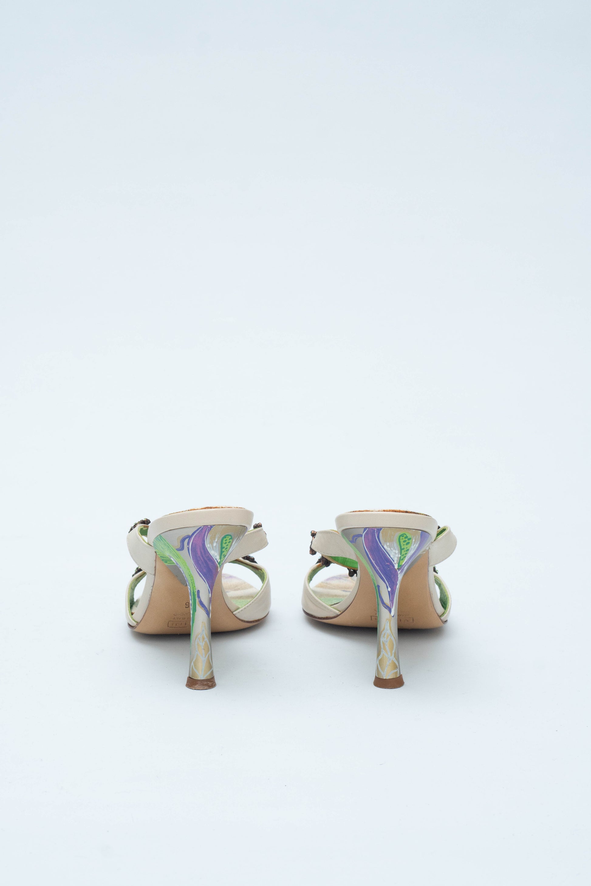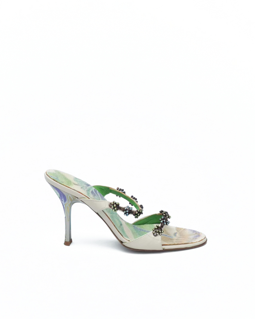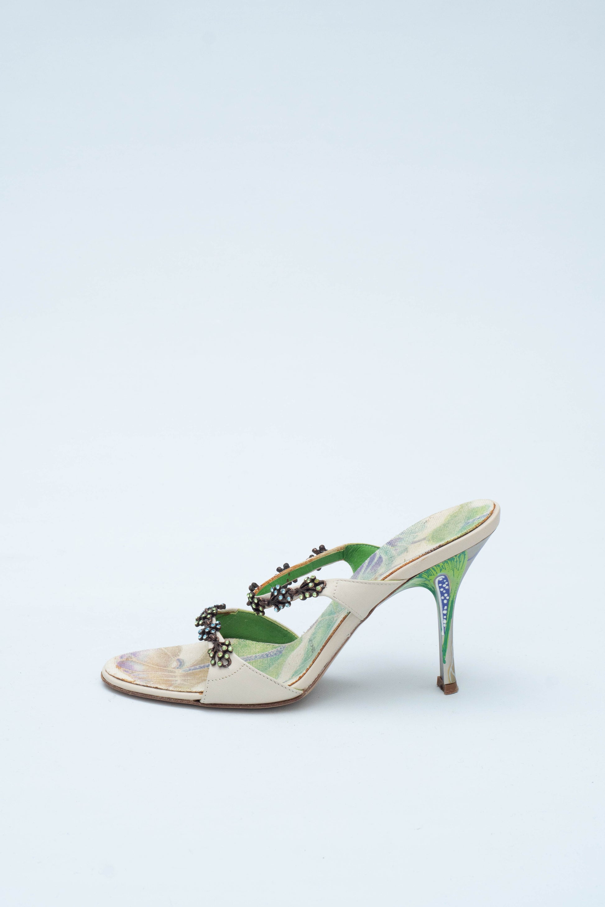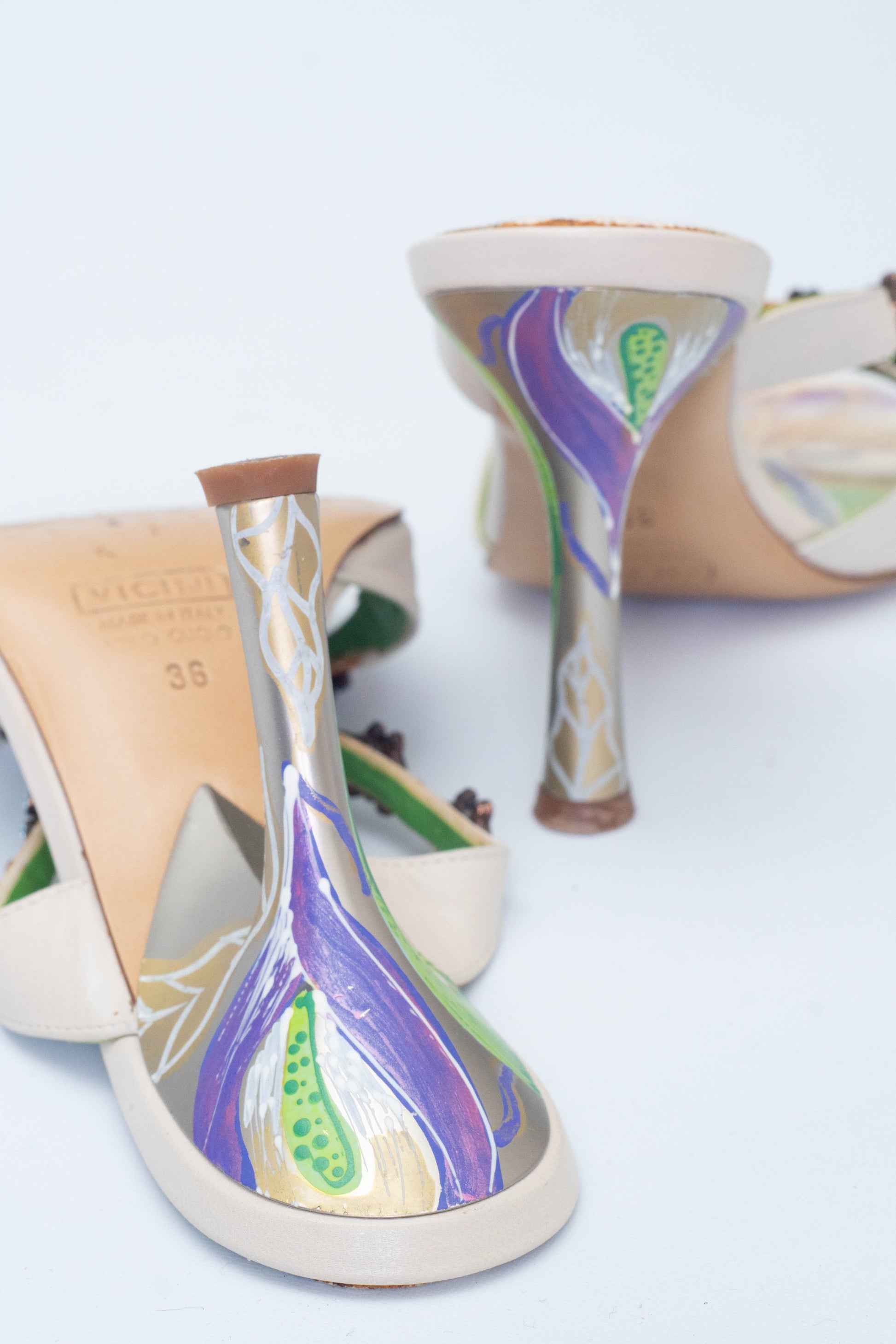 Rhinestones flowers Vicini heels with amazing details. A very unique pair for a very unique girl. The heel measures 8 cm. Excellent vintage condition. All blemishes are shown in the pictures.